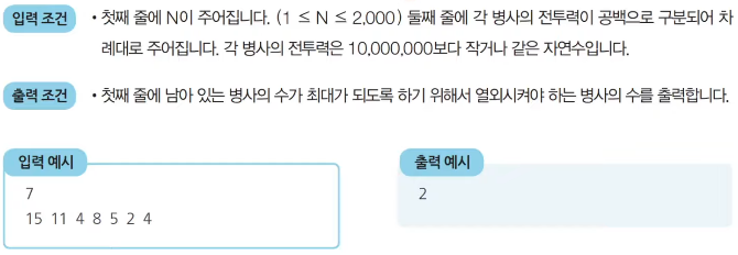 - 병사를 배치할 때는 전투력이 높은 병사가 앞쪽에 오도록 내림차순으로 배치하고자 한다. 다시 말해 앞쪽에 있는 병사의 전투력이 항상 뒤쪽에 있는 병사보다 높아야 한다.