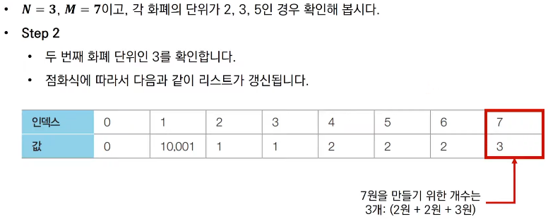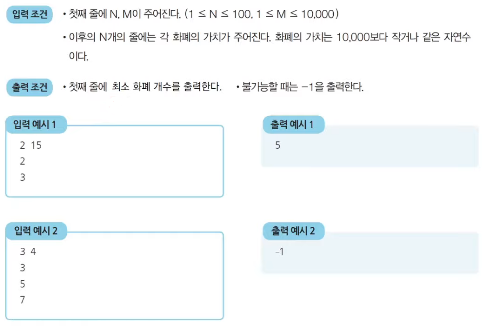 - N가지 종류의 화폐가 있다. 이 화폐들의 개수를 최소한으로 이용해서 그 가치의 합이 M원이 되도록 하려고 한다. 이때 각 종류의 화폐는 몇 개라도 사용할 수 있다.