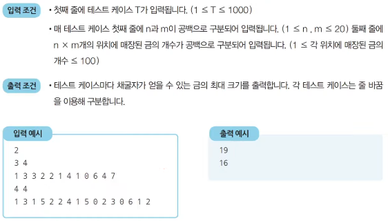 - 채굴자는 첫 번째 열부터 출발하여 금을 캐기 시작한다. 맨 처음에는 첫 번째 열의 어느 행에서든 출발할 수 있다. 이후에 m - 1번에 걸쳐서 매번 오른쪽 위, 오른쪽, 오른쪽 아래 3가지 중 하나의 위치로 이동해야 한다. 결과적으로 채굴자가 얻을 수 있는 금의 최대 크기를 출력하는 프로그램을 작성해라.