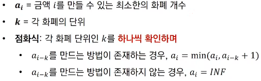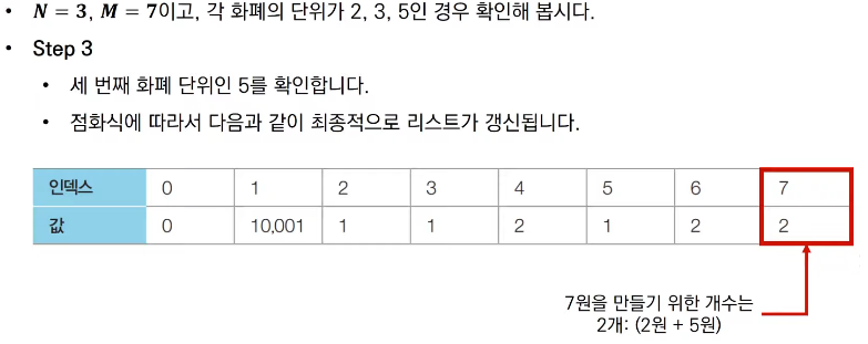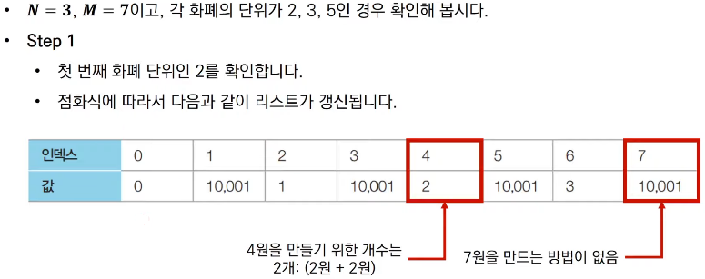 - 예를 들어 2원, 3원 단위의 화폐가 있을 때는 15원을 만들기 위해 3원을 5개 사용하는 것이 가장 최소한의 화폐 개수이다.