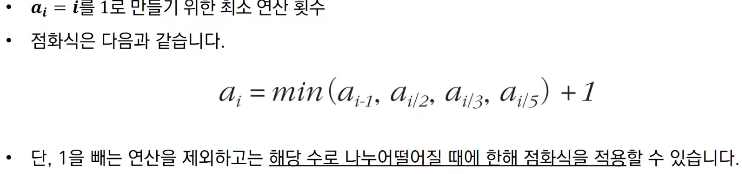 그리디 파트에서 배웠던 1이 될 때까지 와는 차이가 있다. 1이 될 때까지의 문제는 해당 변수가 현재 어떤 값을 가지든 간에 항상 1을 빼는 것보다 나누는 작업이 더 값을 빠르게 줄일 수 있기 때문에 매 상황마다 단순히 나누어 떨어진다면 나눌 수 있도록 하는 아이디어가 사용될 수 있었는데 본 문제에서는 지금 당장 5로 나누었을 때 값이 더 줄 수 있는 것처럼 보이지만 다른 연산들을 적절히 섞어서 더 빠르게 값을 줄일 수 있는 경우가 존재할 수 있기 때문에 이 문제는 단순한 그리디 해법으로 해결하기 어렵다...