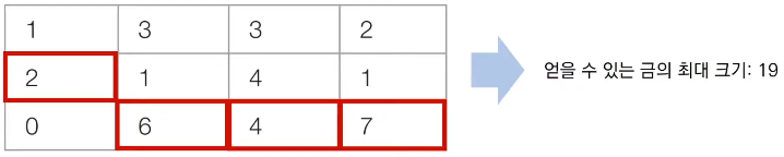 - n x m 크기의 금광이 있다. 금광은 1 x 1 크기의 칸으로 나누어져 있으며, 가 칸은 특정한 크기의 금이 들어있다.